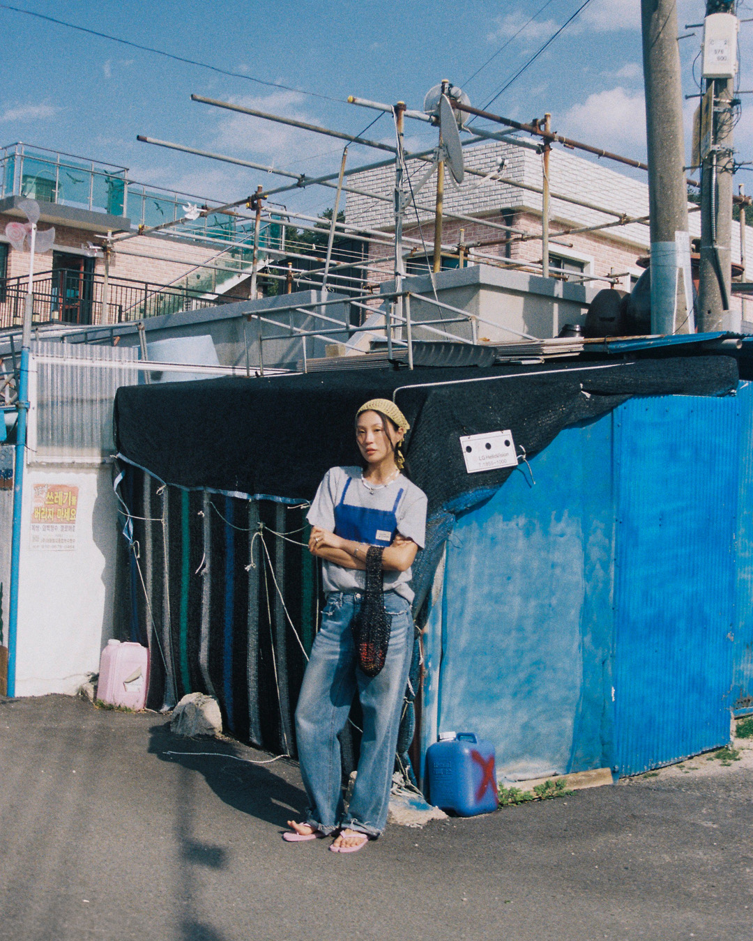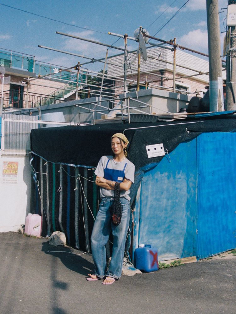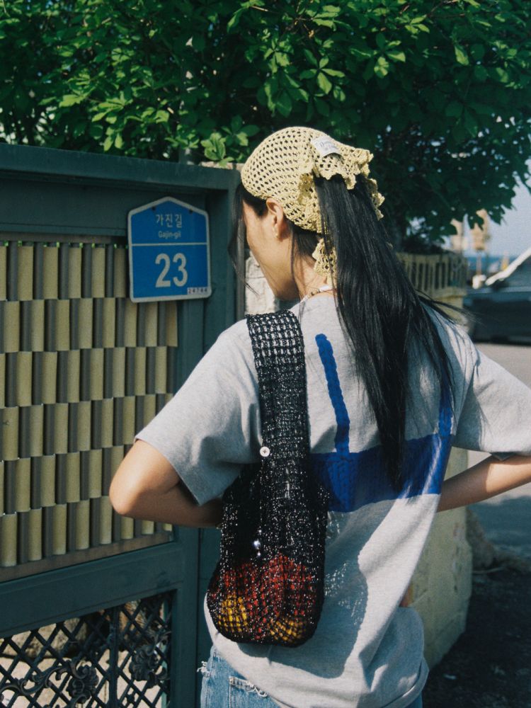 대바늘로 손뜨개 한 크로셰 뷔스티에를 티셔츠 위에 레이어드 한 듯한 유쾌함을 담았습니다.
