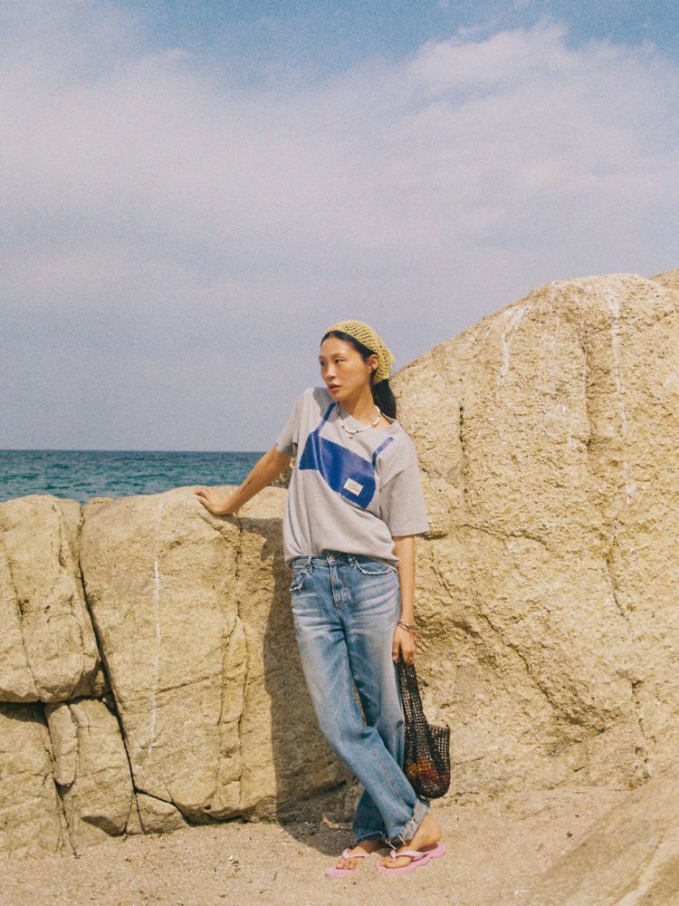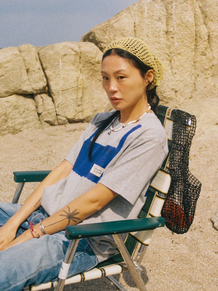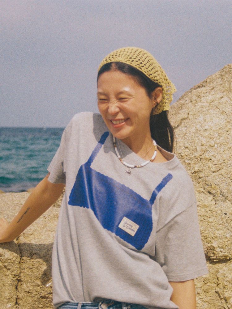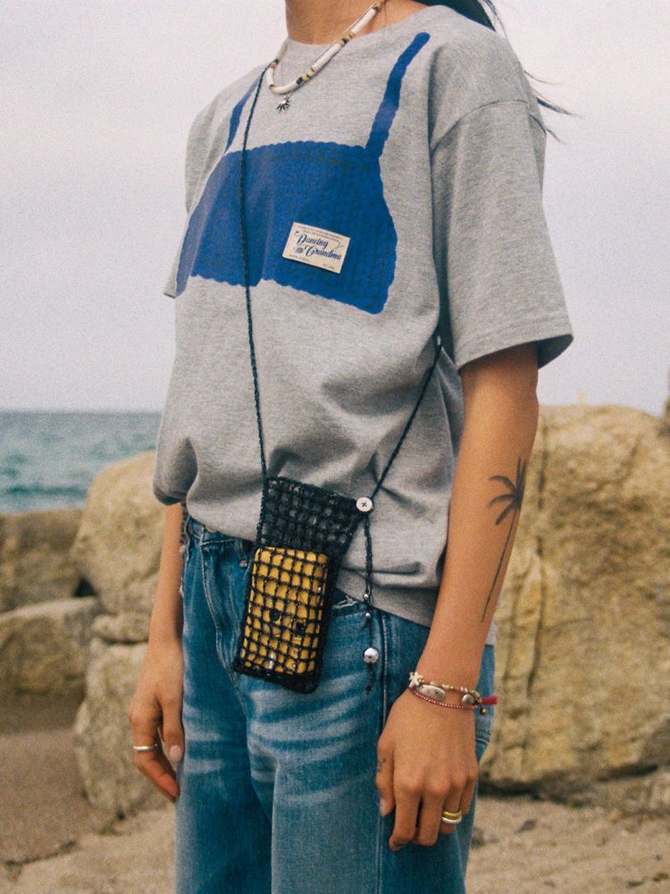 직접 뜬 뷔스티에를 여러 과정에 거쳐 이미지화 했으며, 20수의 탄탄한 소재로 제작된 프린트스타 티셔츠의 앞과 뒷면에 이미지를 전사하는 방식으로 제작했습니다. 티셔츠 앞면에는 댄싱그랜마의 실제 패브릭 라벨이 스티치 되어 입체적인 포인트를 만듭니다.