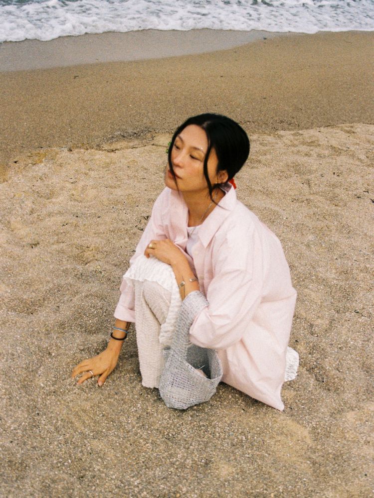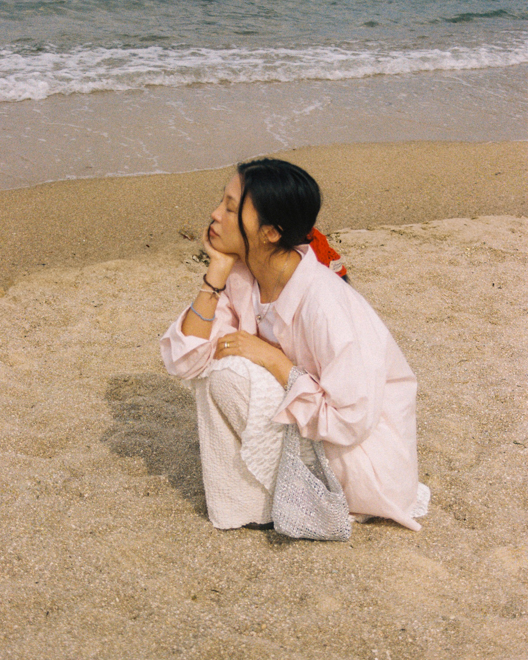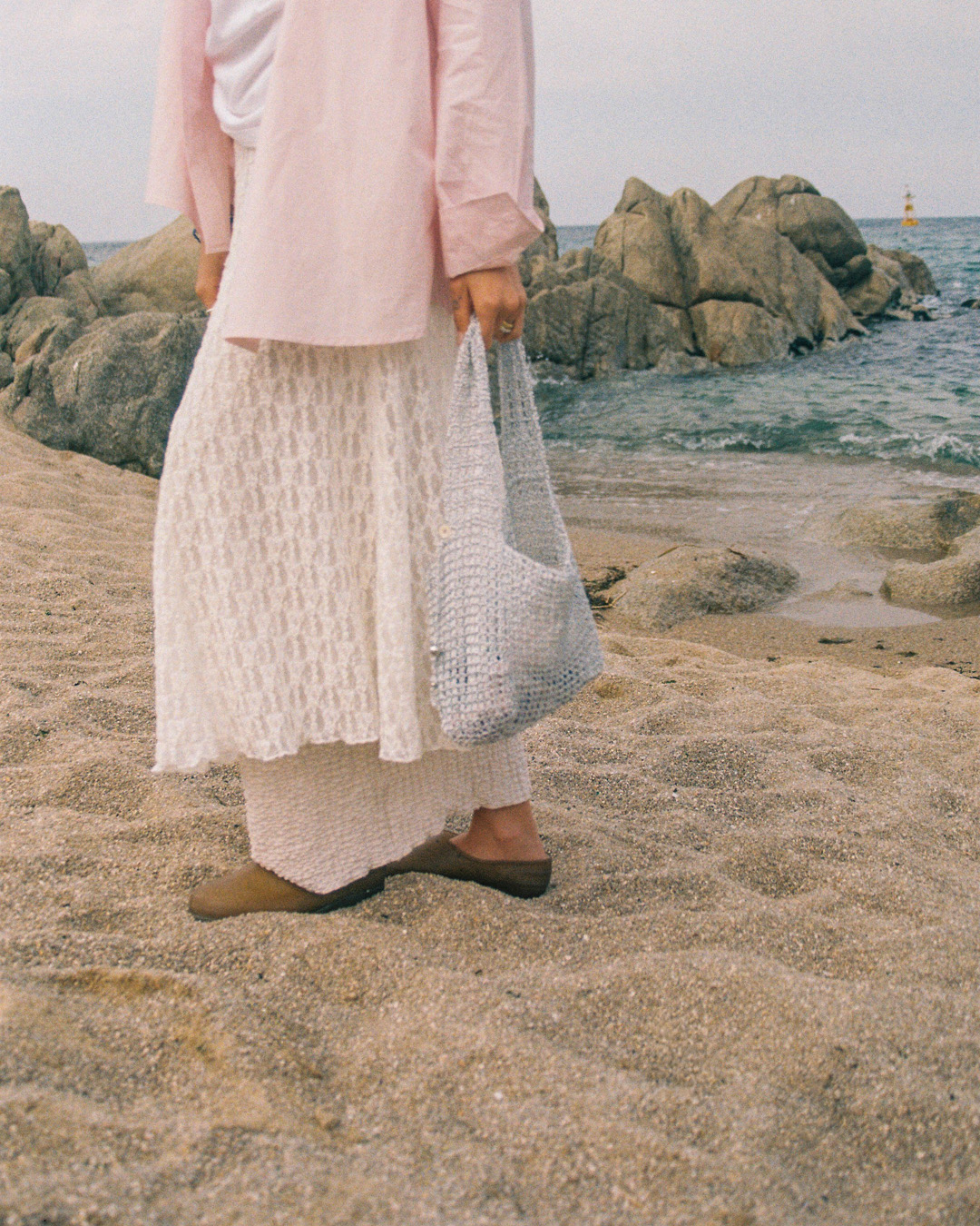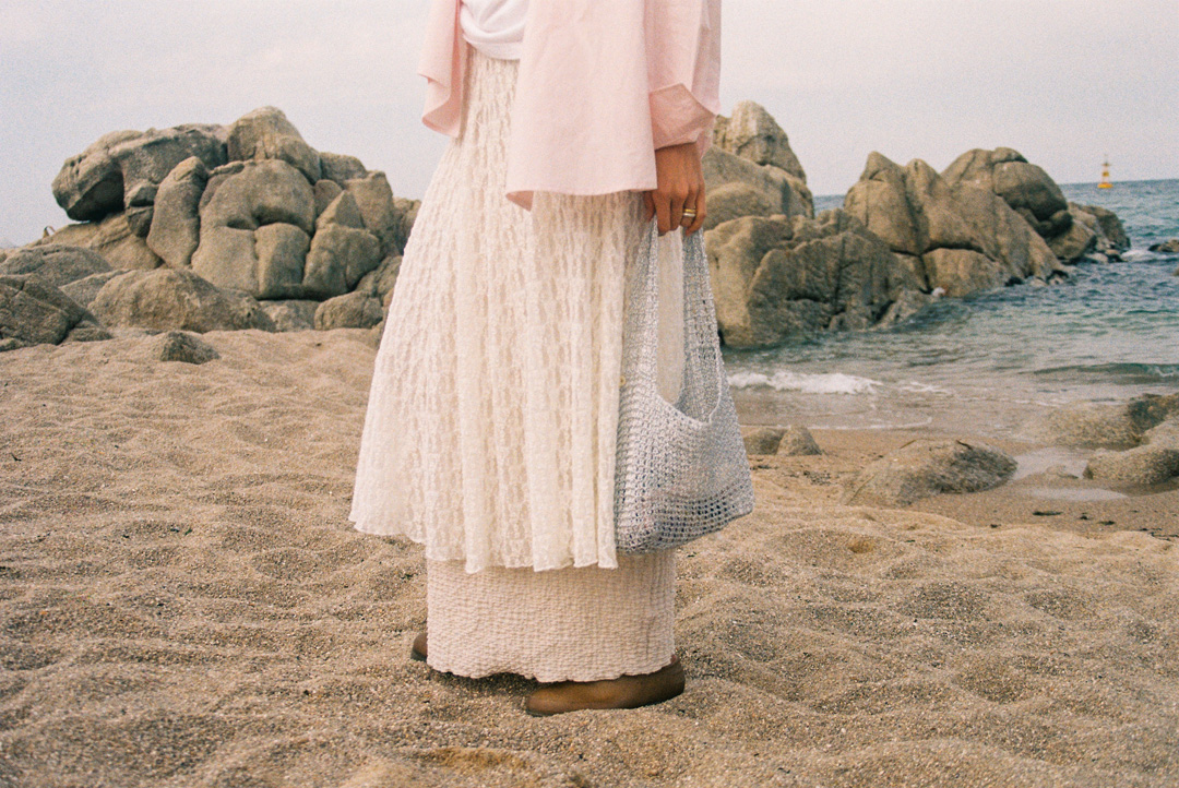 여름날 햇빛과 바다에 비치어 반짝이는 실버 네트 가방,