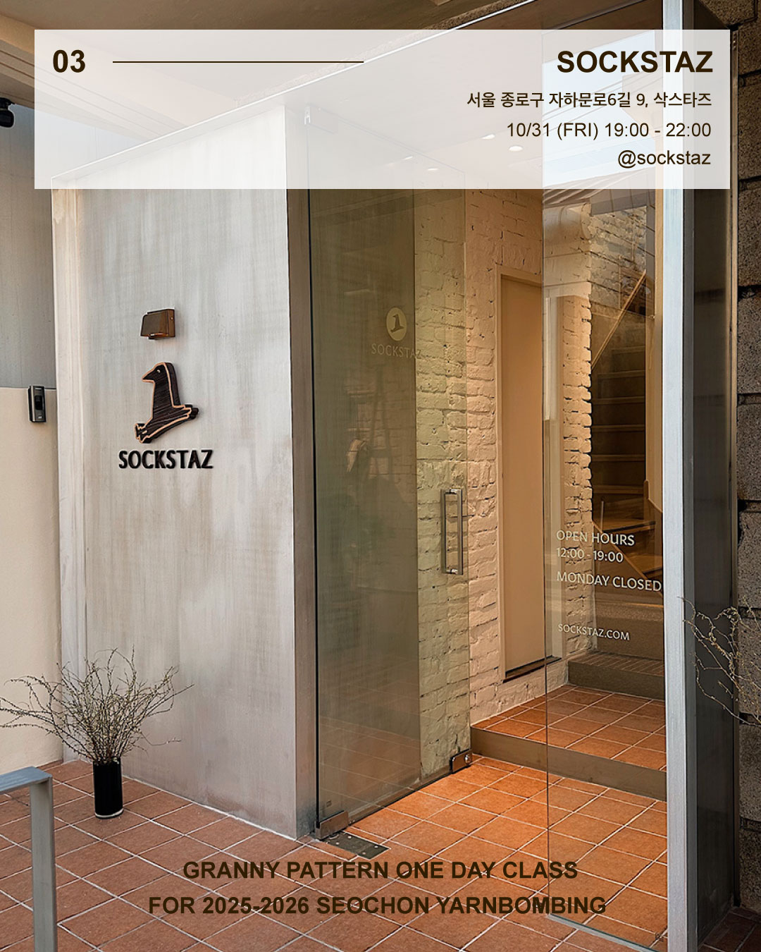 얀바밍(Yarn Bombing) 은 ‘실’을 뜻하는 Yarn과 ‘공공장소‘를 뜻하는 Bombing이 합쳐진 말로, 뜨개로 거리를 장식하는 참여형 예술을 의미합니다. 이번 클래스에서 제작된 작품은 2025년 11월 29일부터 2026년 2월 28일까지 서촌 필운대로 가로수에 전시됩니다.
