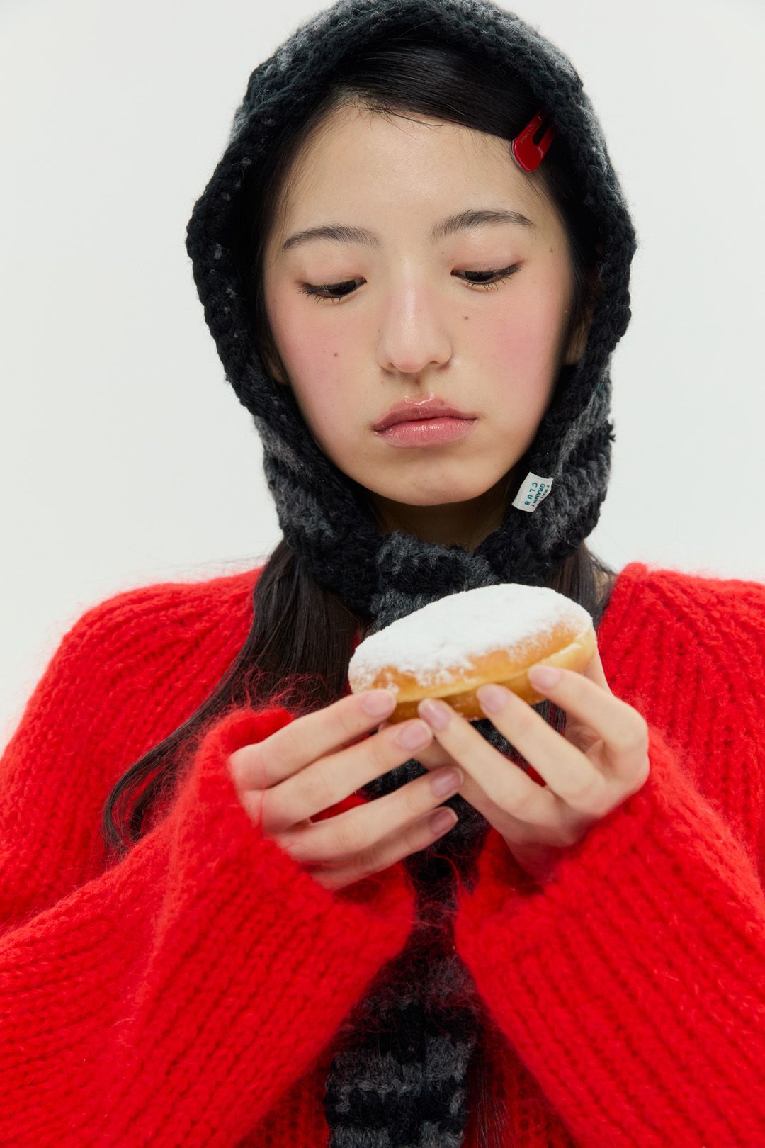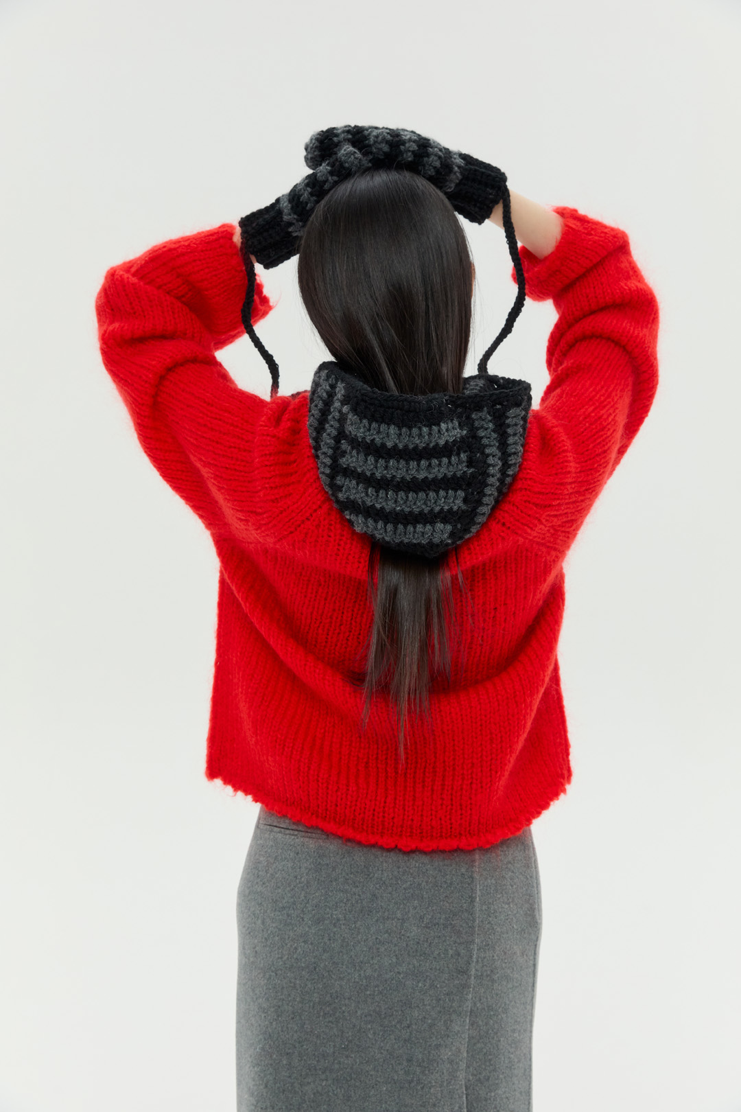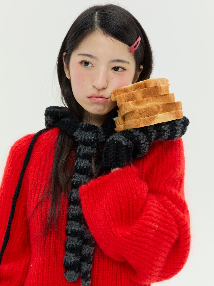 스키니 머플러로 활용할 수 있는 스트랩은 길이를 자유롭게 제작할 수 있어 앞쪽으로 길게 풀거나 묶어 스타일링할 수 있으며, 두꺼운 아우터 위에 후드를 착용한 것처럼 포인트를 줄 수 있습니다.