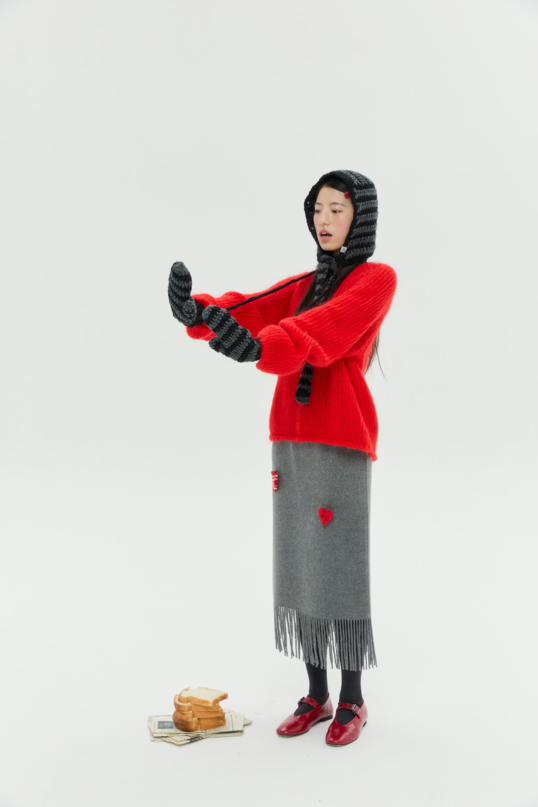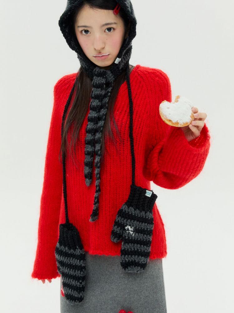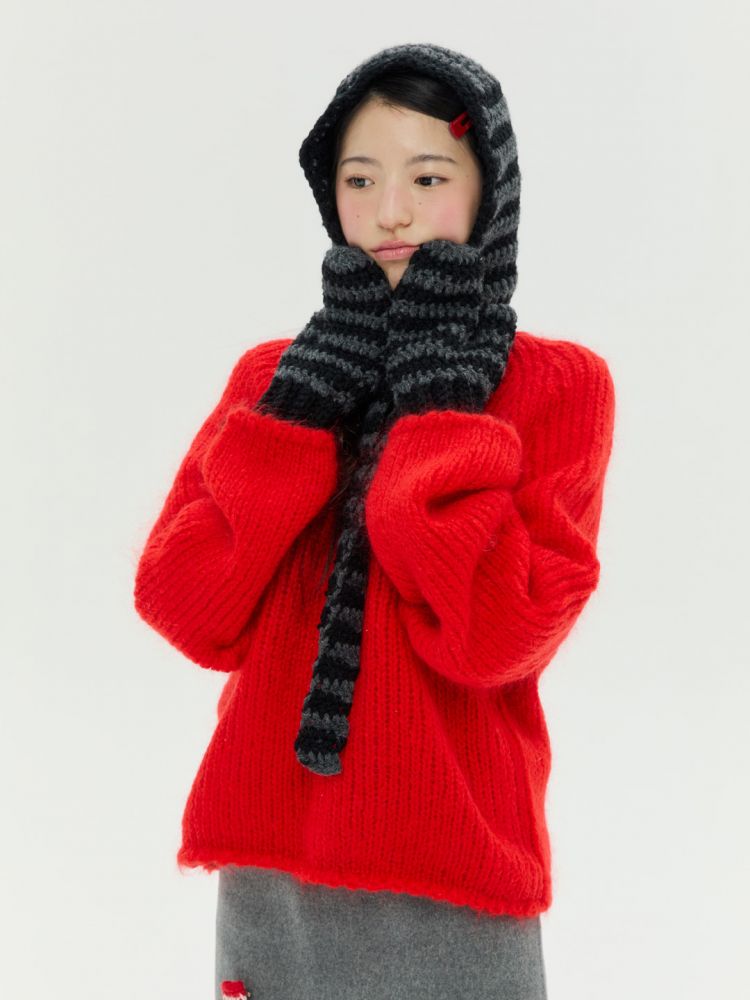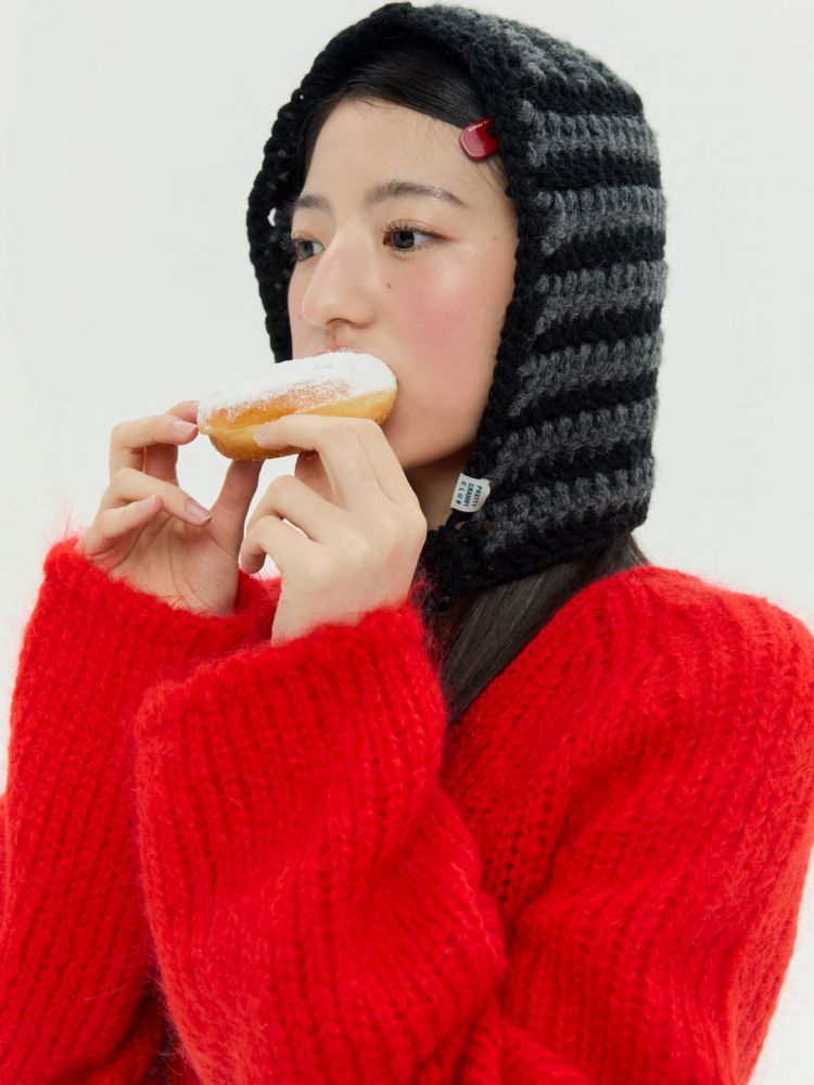 도톰하고 따뜻한 촉감의 실과 컬러 배색이 특징인 청키 스트라이프 바라클라바 입니다.
