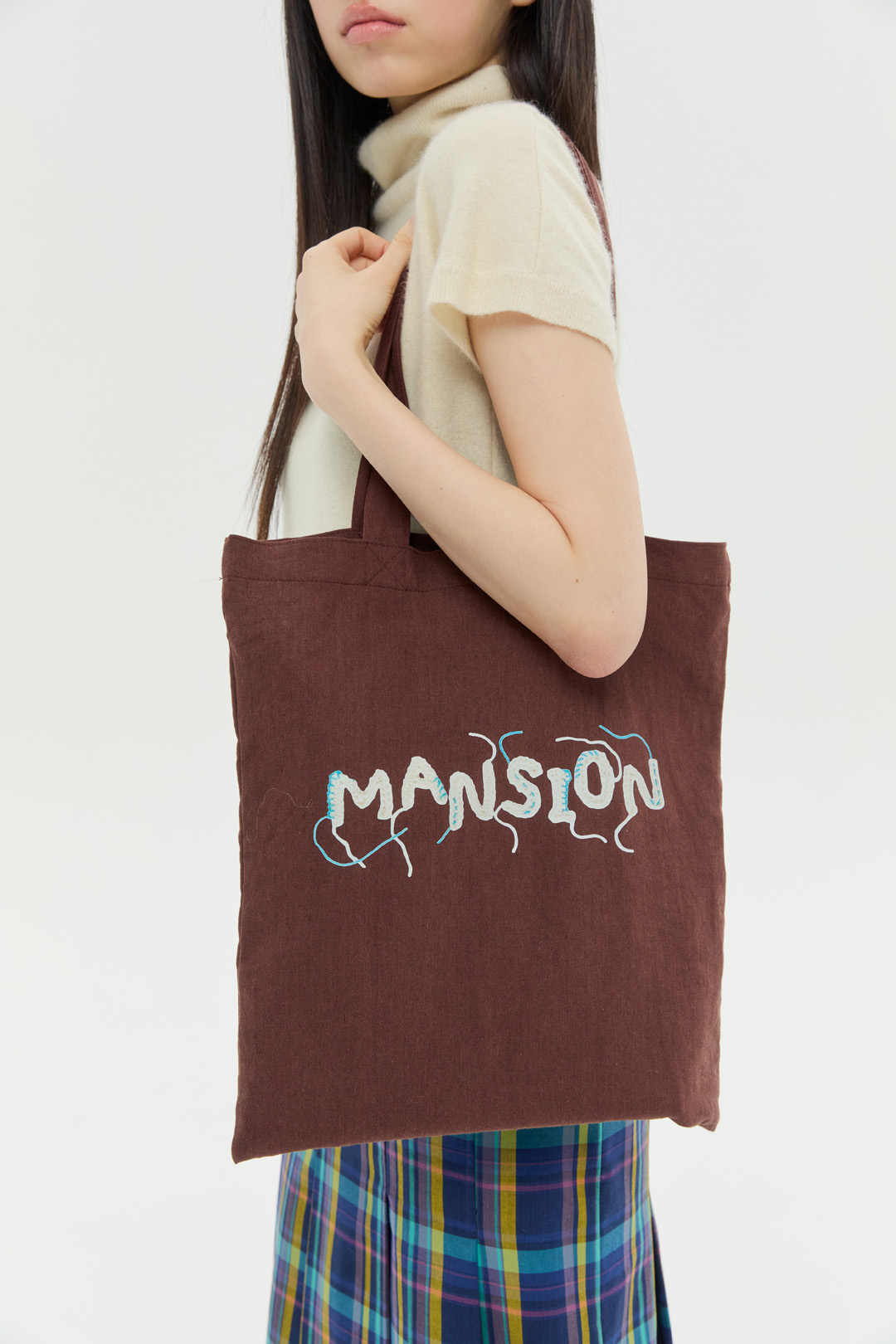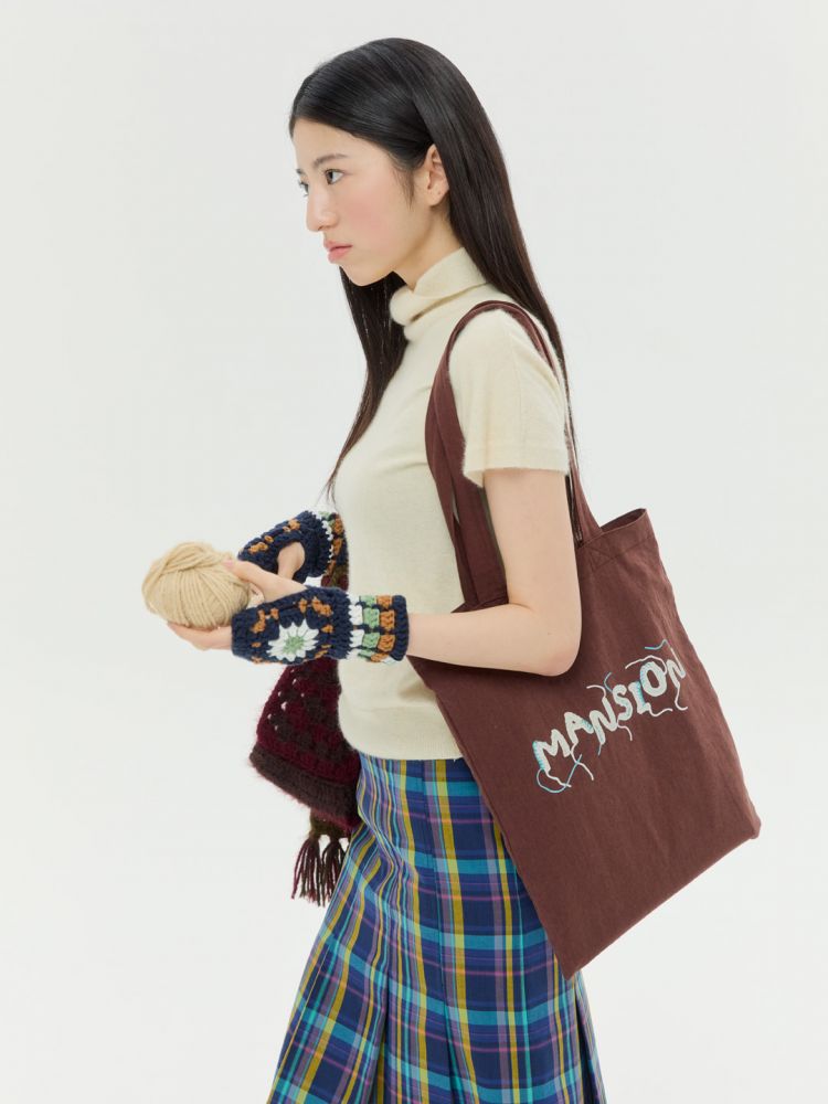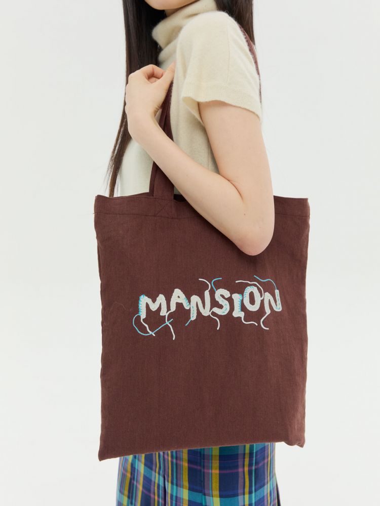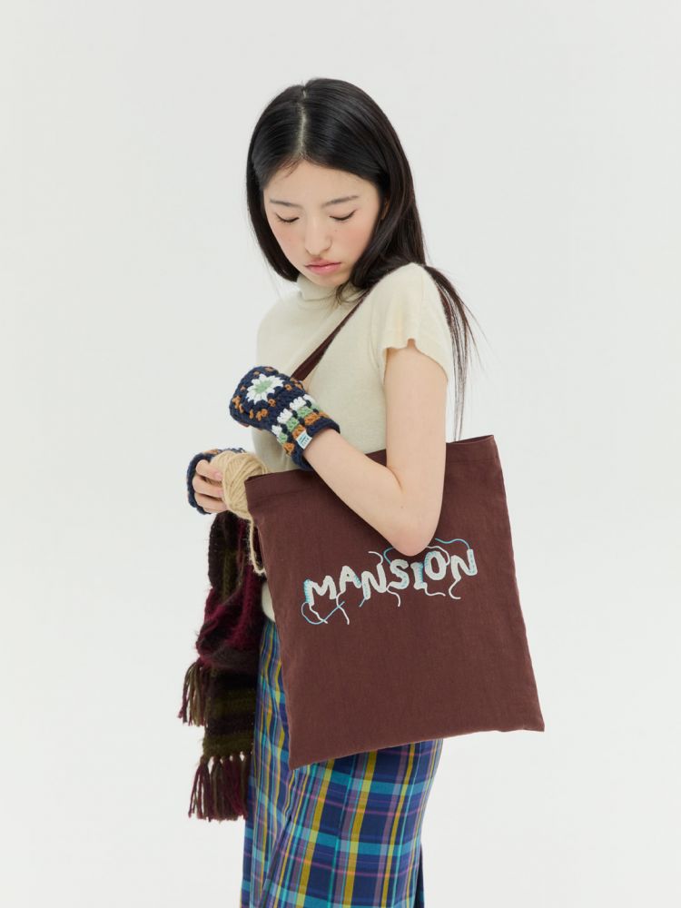 크로셰 기법으로 제작한 "DANCING MANSION' 이니셜에 자연스럽게 잘라내지 않은 실 디테일을 가방 앞 뒷면에 프린팅 하였습니다. 가을, 겨울에 어울리는 따뜻한 브라운 컬러의 린넨 소재 에코백이며 니트 혹은 겨울 아우터 위에 예쁘게 스타일링 됩니다.