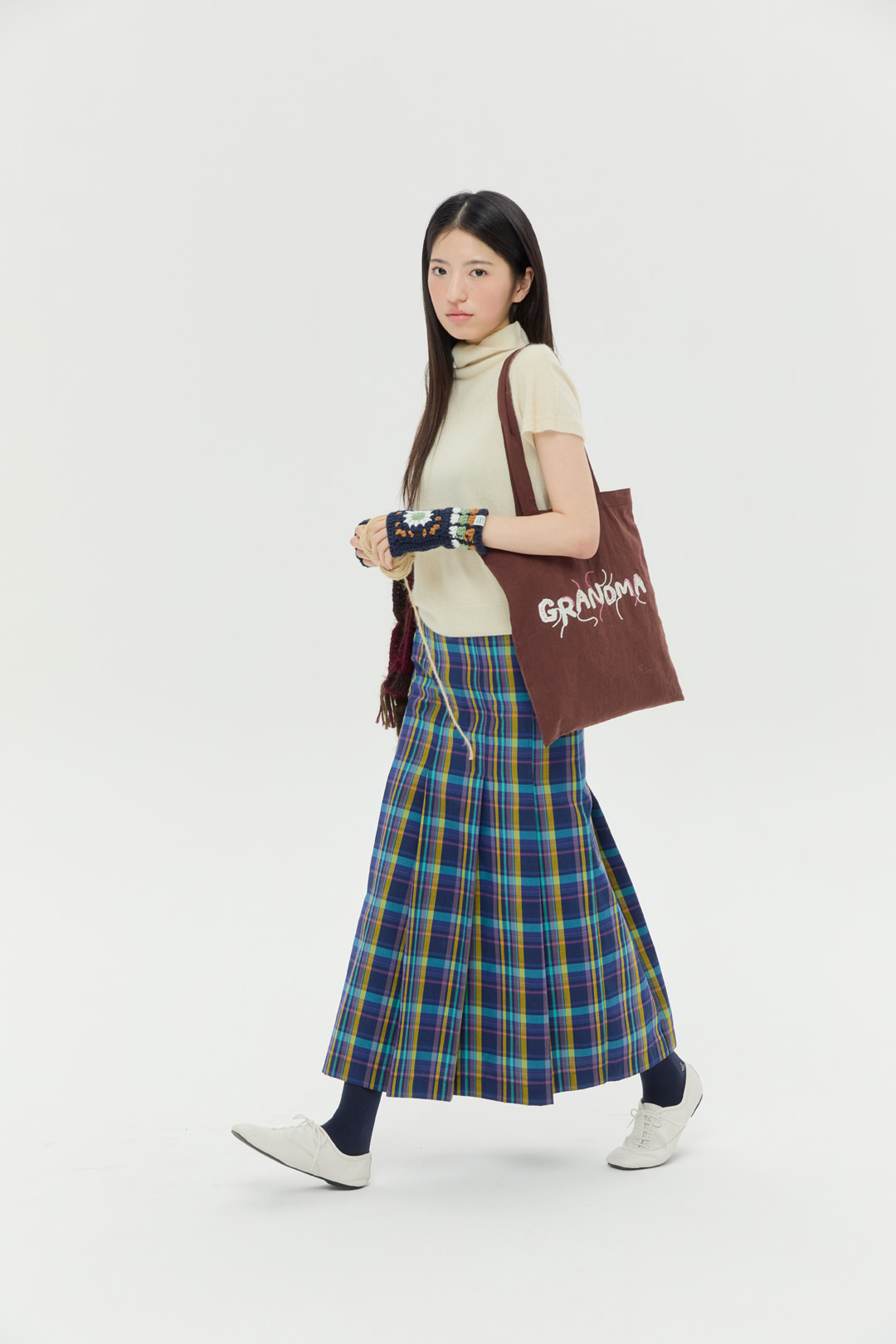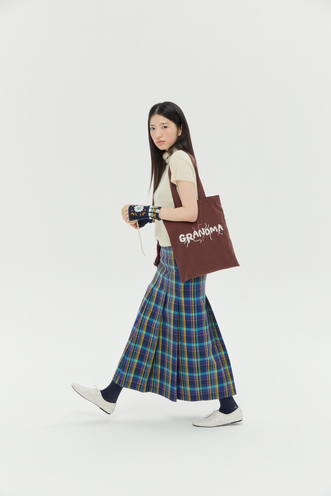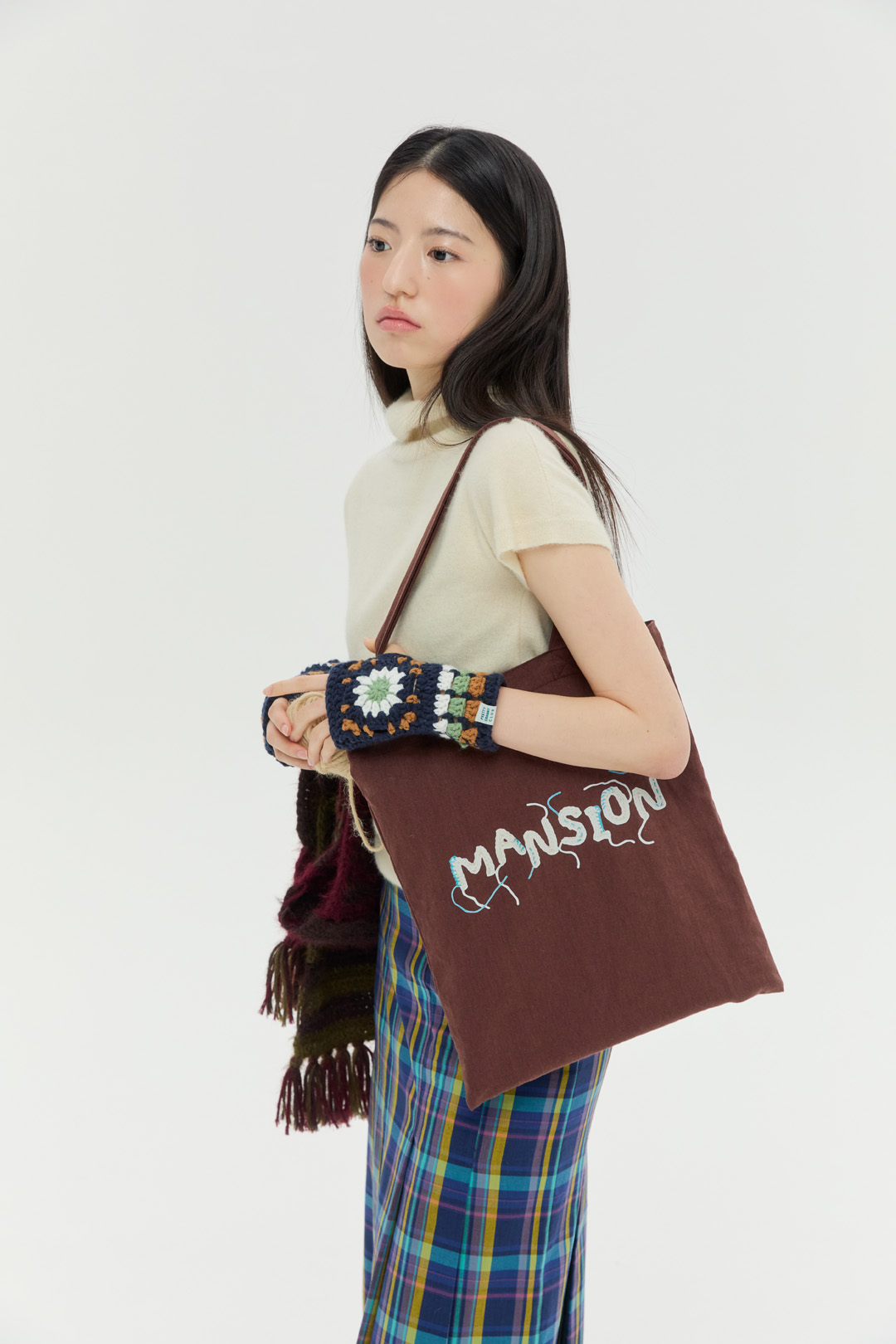 크로셰 기법으로 제작한 "DANCING MANSION' 이니셜에 자연스럽게 잘라내지 않은 실 디테일을 가방 앞 뒷면에 프린팅 하였습니다.