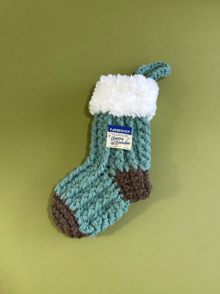 *코지 크리스마스 스타킹은 울 30%, 아크릴 70% / 퍼 부분 폴리에스터 100%의 실을 사용해 핸드니팅으로 제작했습니다.