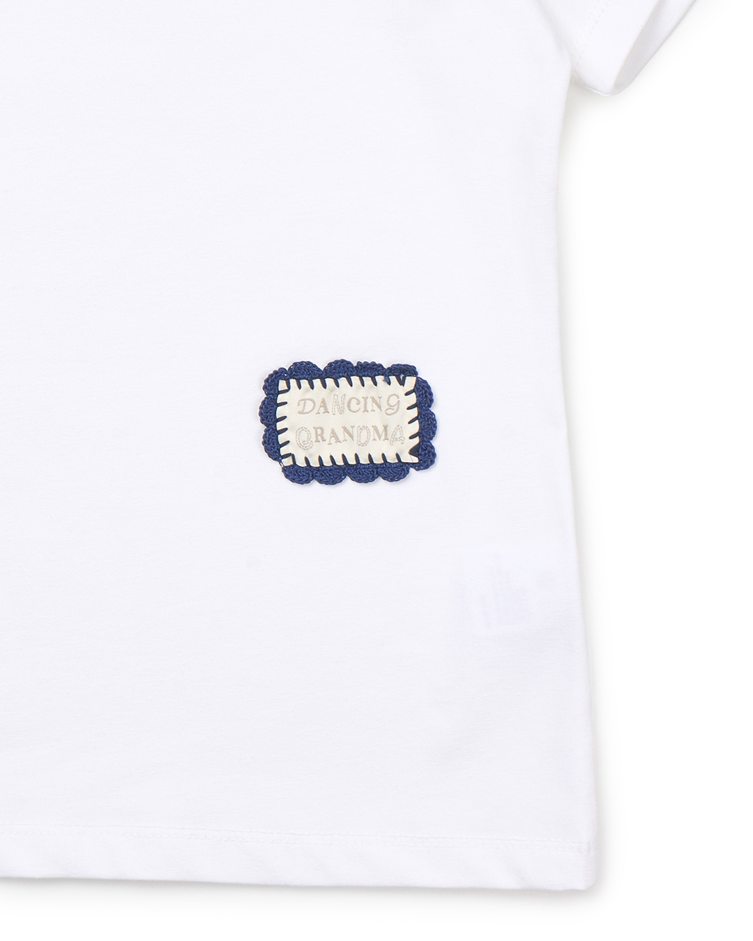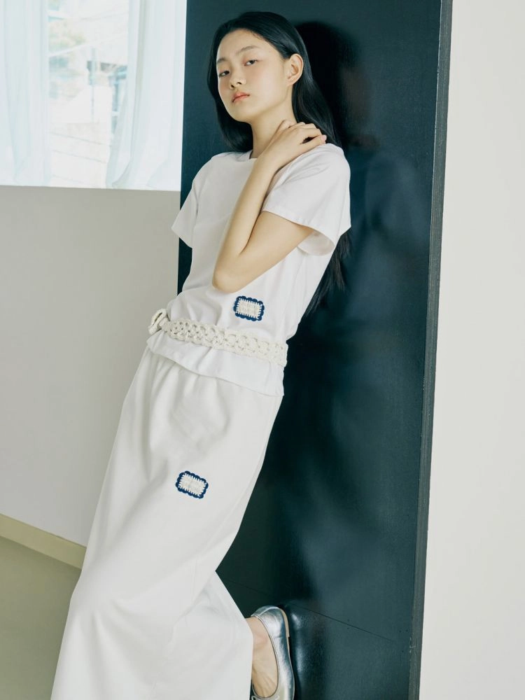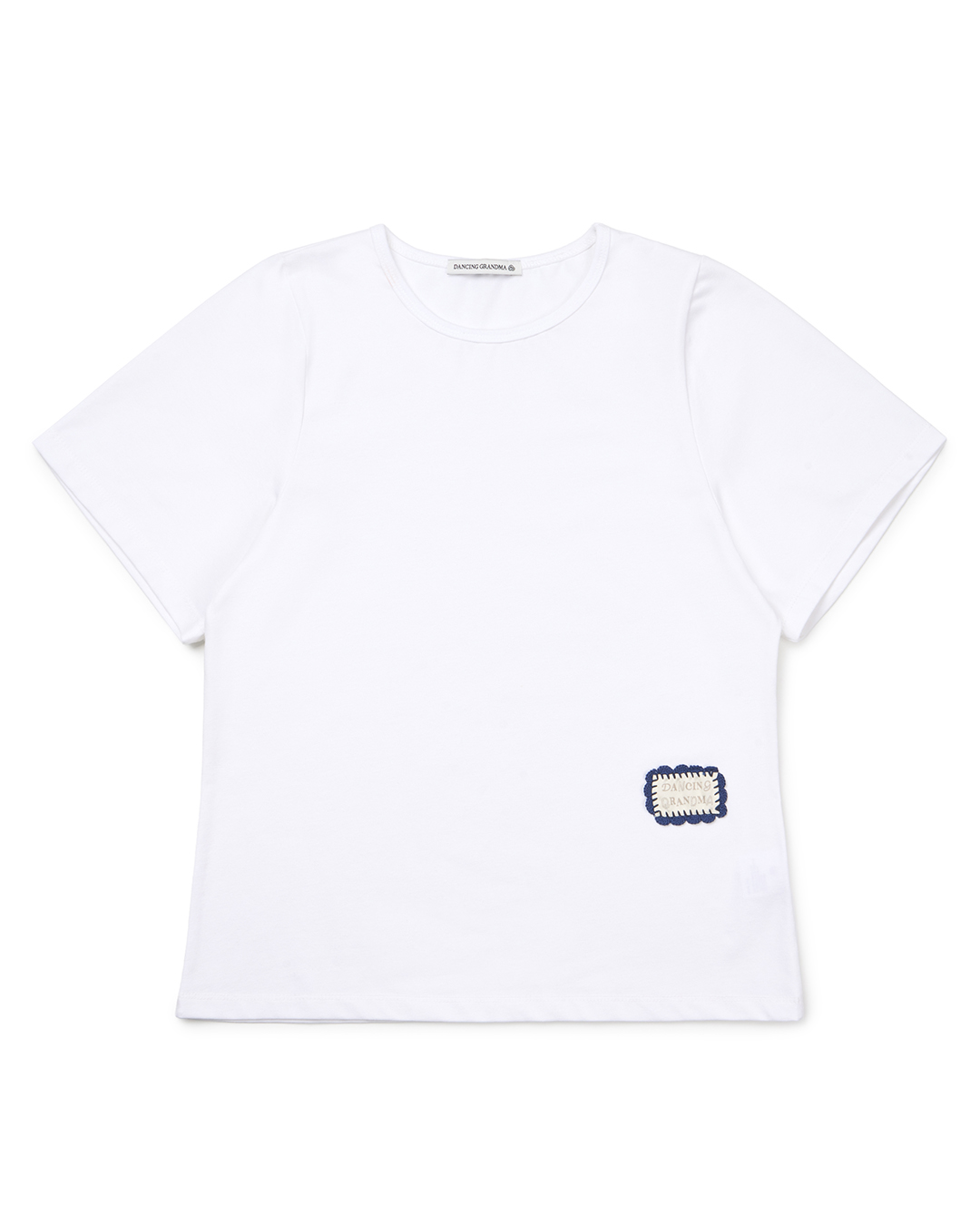 핸드메이드 크로셰 장식의 시즌 라벨이 앞면 왼쪽에 포인트 되는 코튼 티셔츠입니다.