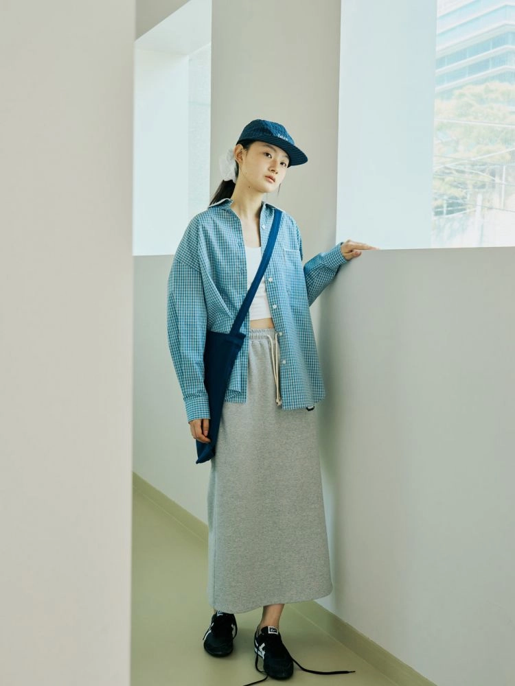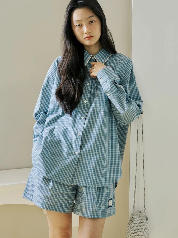 셔츠의 두 원단 소재 차이로 인해 라일락 컬러 셔츠는 무게감이 있는 실루엣을 연출, 체크블루 컬러 셔츠는 자연스럽게 떨어지는 가벼운 실루엣으로 연출할 수 있습니다.