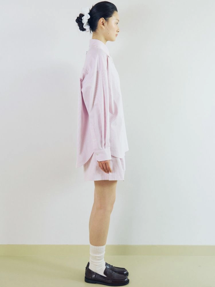 셔츠의 두 원단 소재 차이로 인해 라일락 컬러 셔츠는 무게감이 있는 실루엣을 연출, 체크블루 컬러 셔츠는 자연스럽게 떨어지는 가벼운 실루엣으로 연출할 수 있습니다.